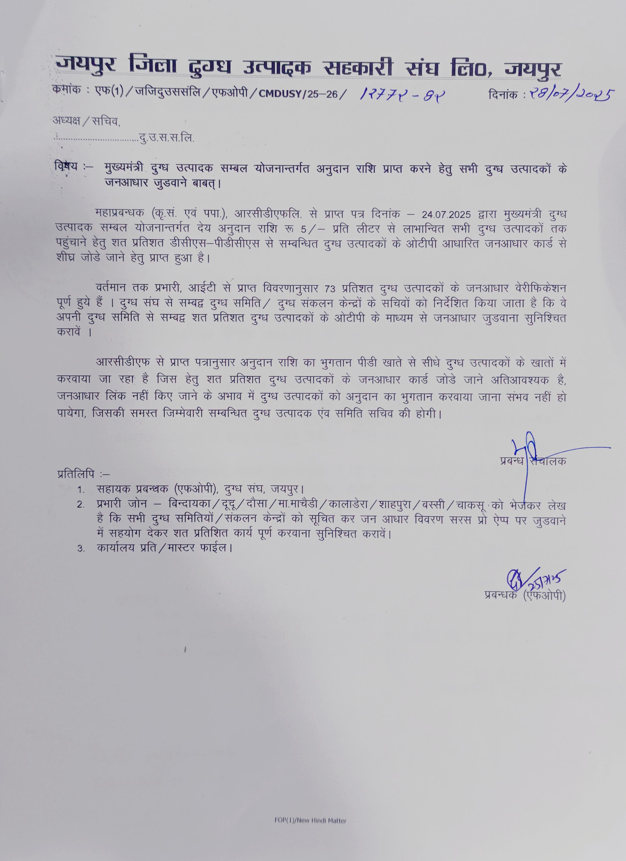 | 28-07-2025 | मुख्य्मंत्री दुग्ध उत्पादक संबल योजनान्तर्गत अनुदान राशि प्राप्त करने हेतु सभी दुग्ध उत्पादकों के जनाधार जुड़वाने बाबत। |